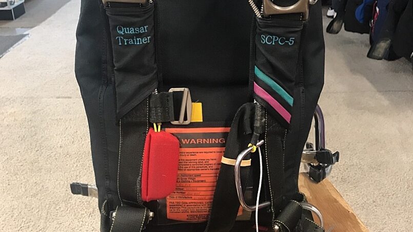 Fully equipped, complete skydiving rig, ideal for beginner to intermediate jumpers or larger jumpers seeking a stable, forgiving, and reliable setup. This rig includes a Quasar 101735 T5 container, a Falcon 265 main canopy, a Tempo 210 reserve, and a Vigil Cuatro AAD.